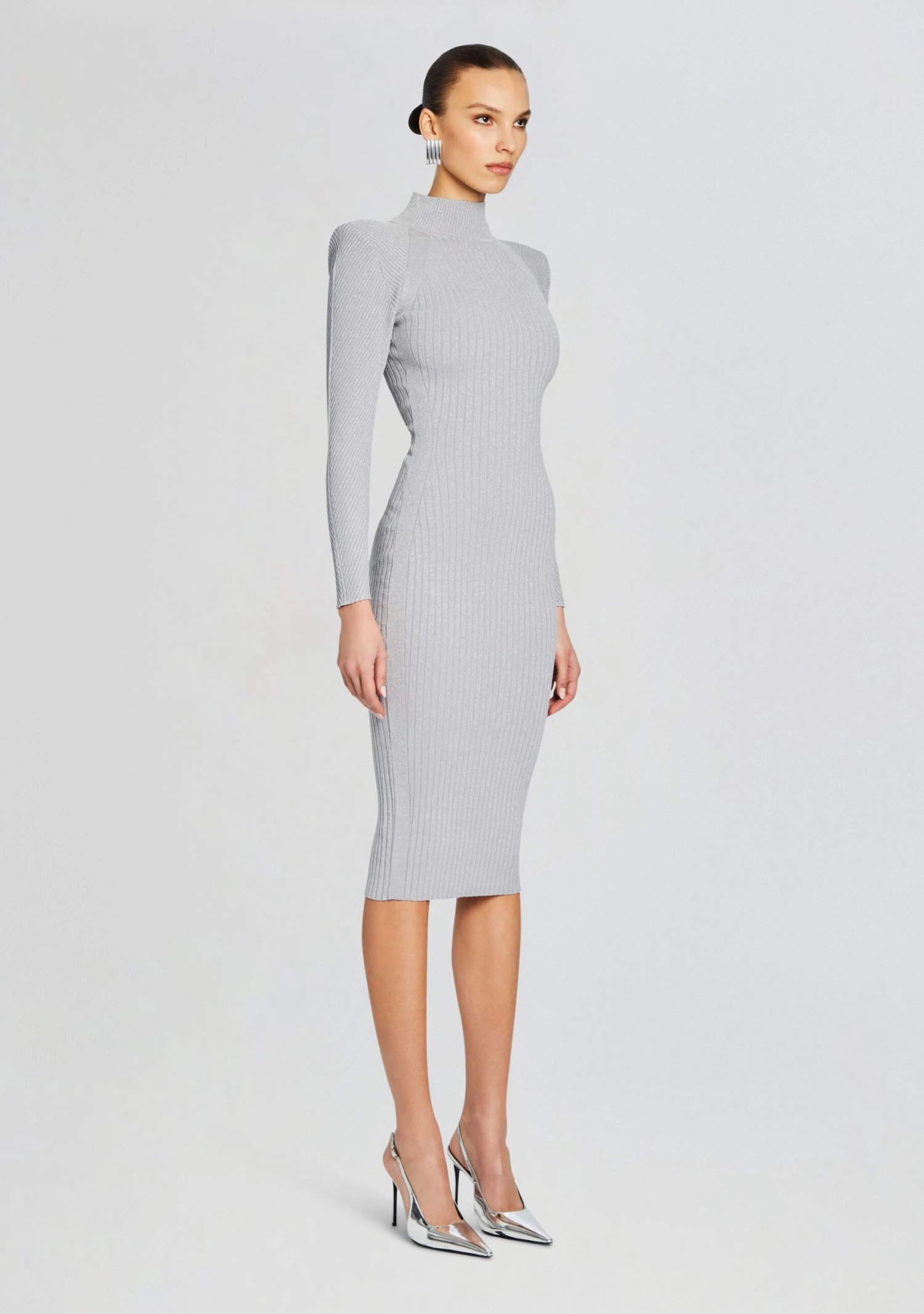 Step into the spotlight with out Aylin Dress. The high neck, metallic knit, and shoulder pads combine for a bold and modern look. The bodycon fit highlights your curves, making this dress perfect for a night out or a chic event. Shown in Silver Grey.