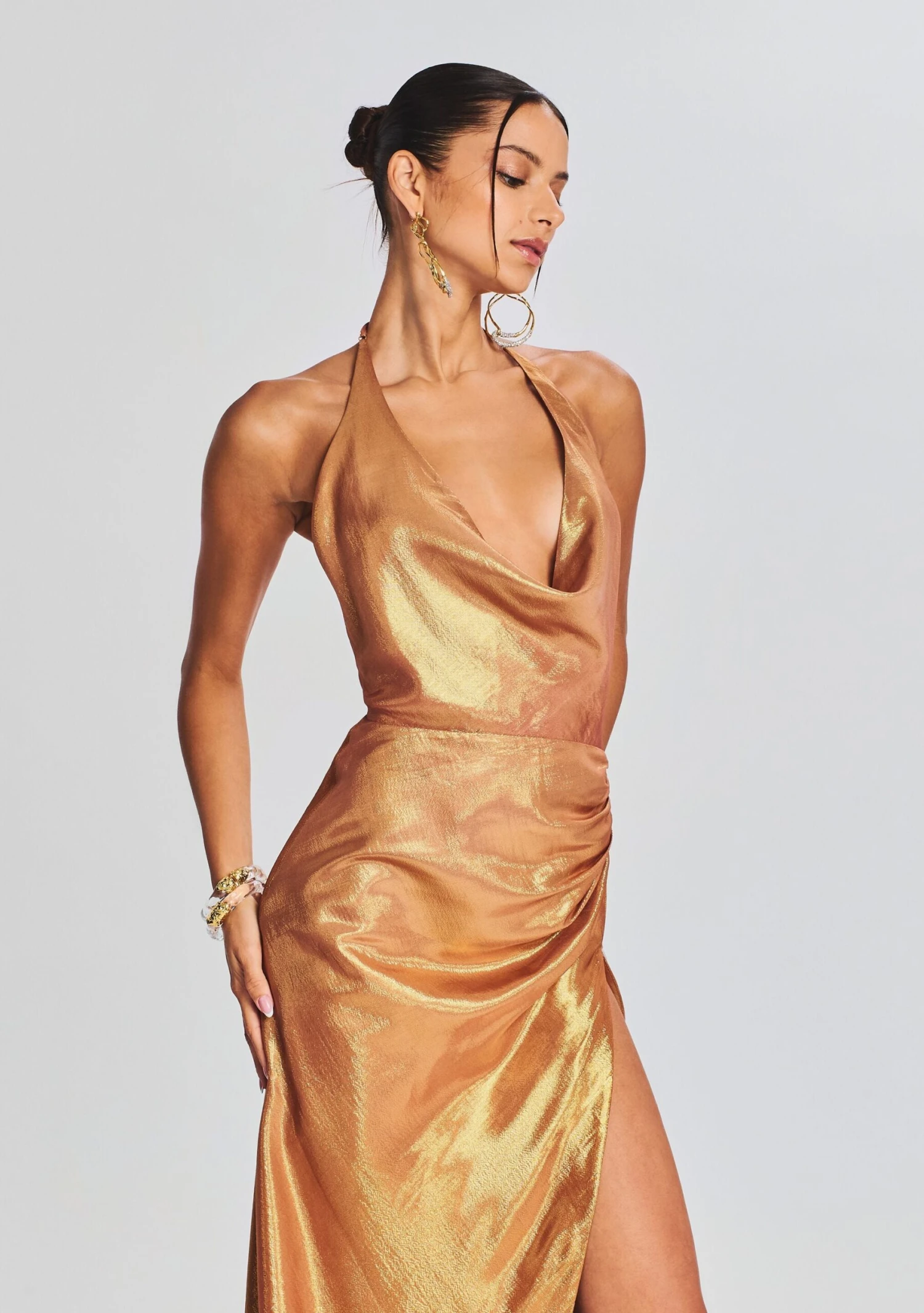 Dare to shine in our Cleo Dress. This cowl neck halter dress features a pleated detail at the hip and an ultra side slit. Shown here in Nude Glitter.