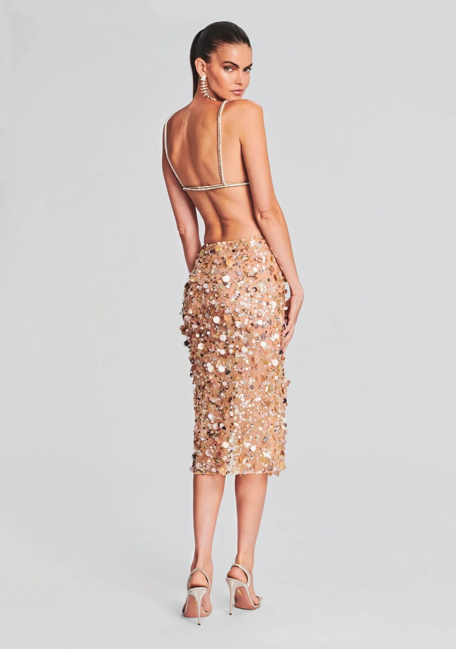 Our Deja Bra is a must. This double-clasped bra features crystal adornments lining the silhouette. Shown here in White/Gold.