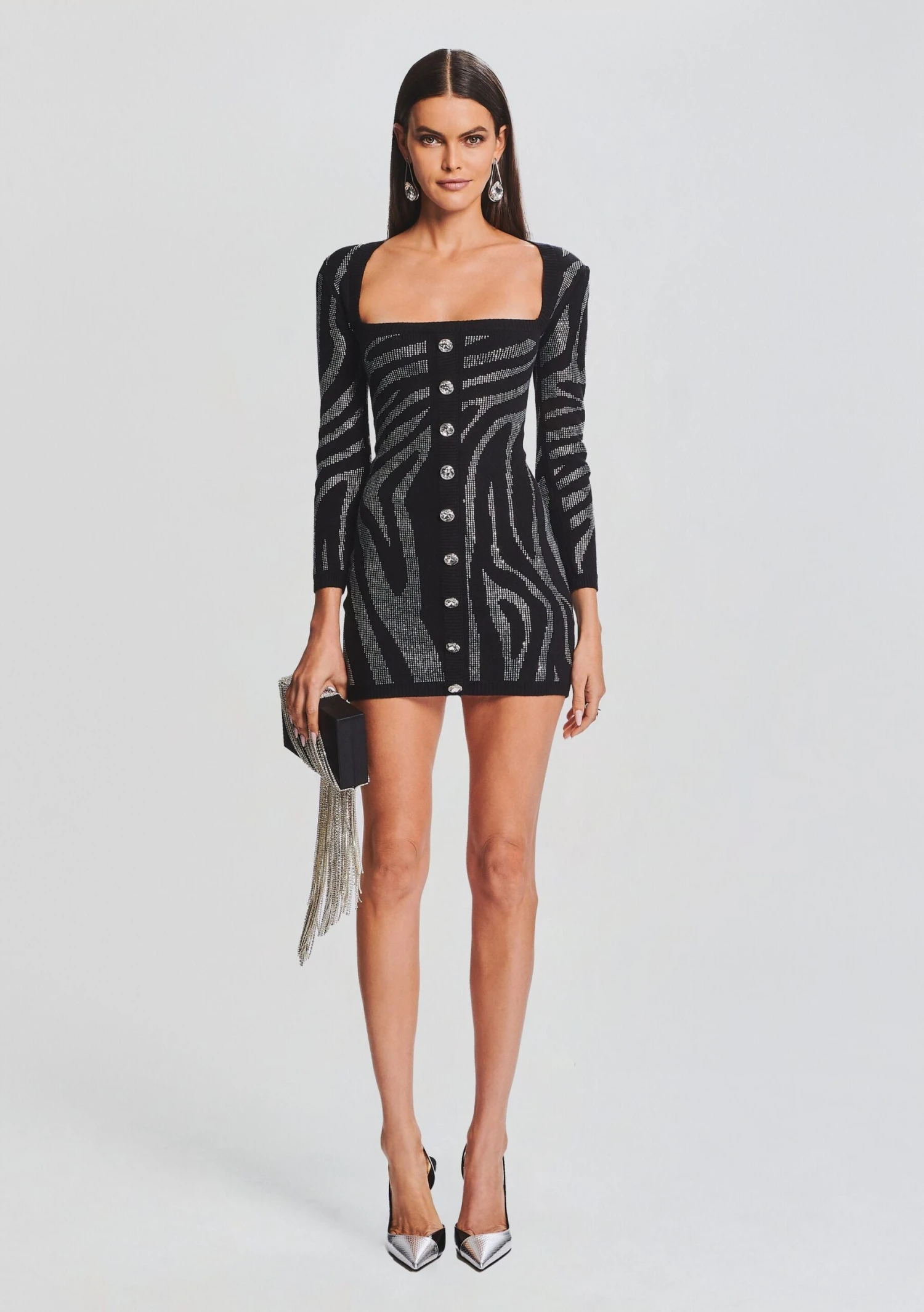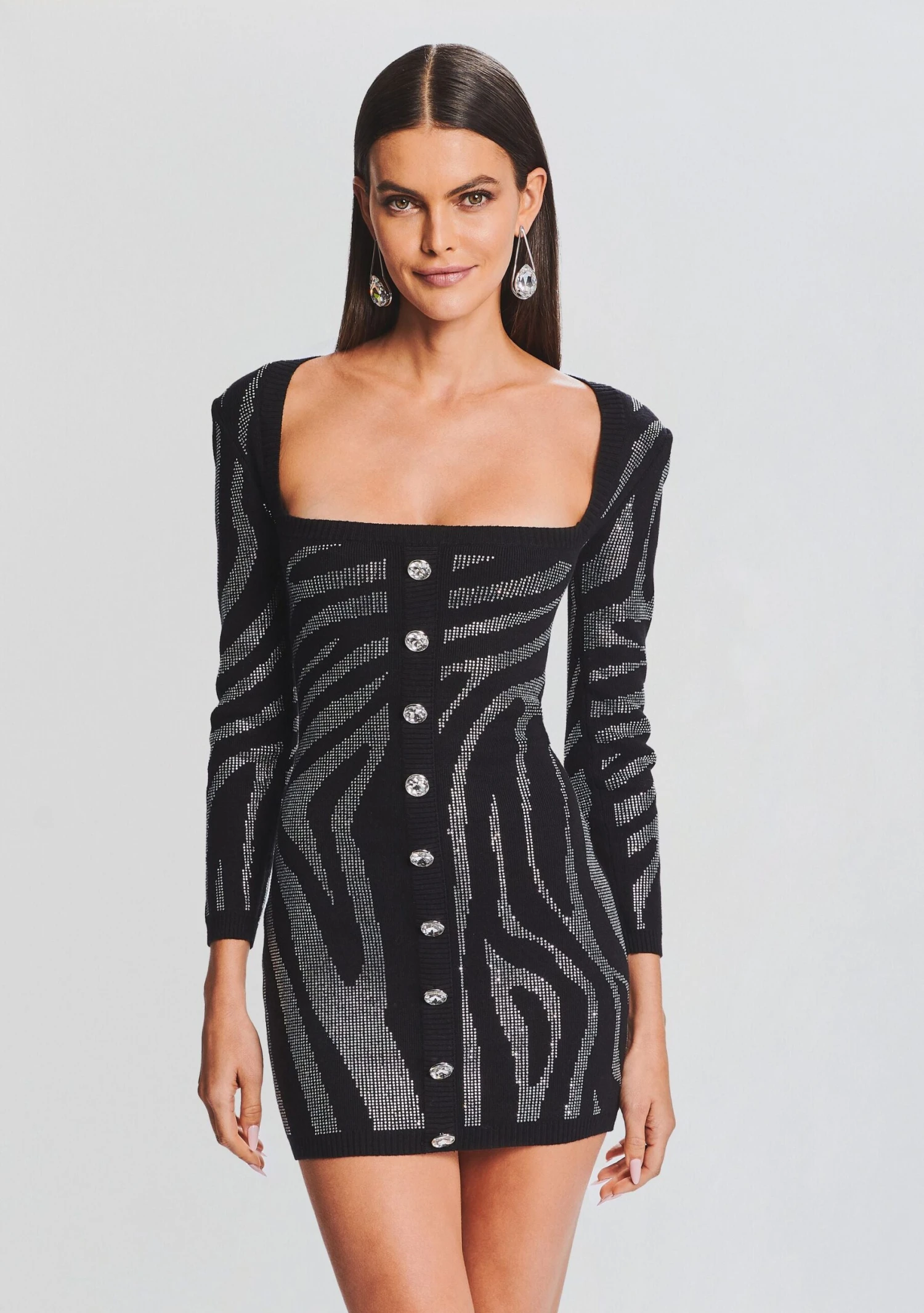 Embrace your wild side with our Elvira Knit Dress. This stunning long-sleeve, sequin embellished knit dress combines bold zebra patterns with edgy allure, making it the perfect choice for a night out on the town and ensuring you stand out in style. Shown here in Black/Silver Zebra.