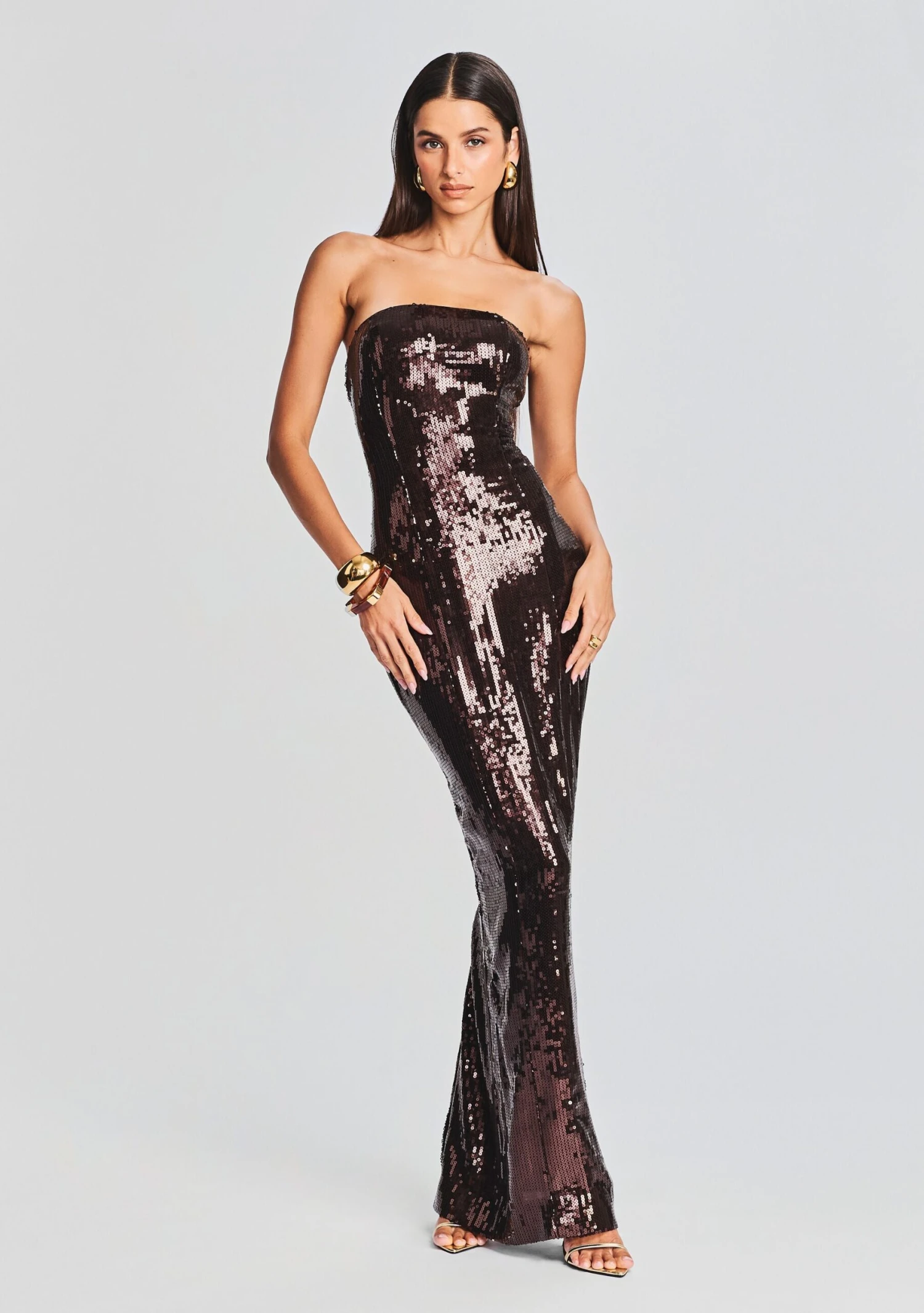 Evoke cutting-edge style in our Ember Dress. This strapless maxi dress features an all-over sequined bodice, coordinating skirt, and flowing hem. Shown here in Dark Chocolate.