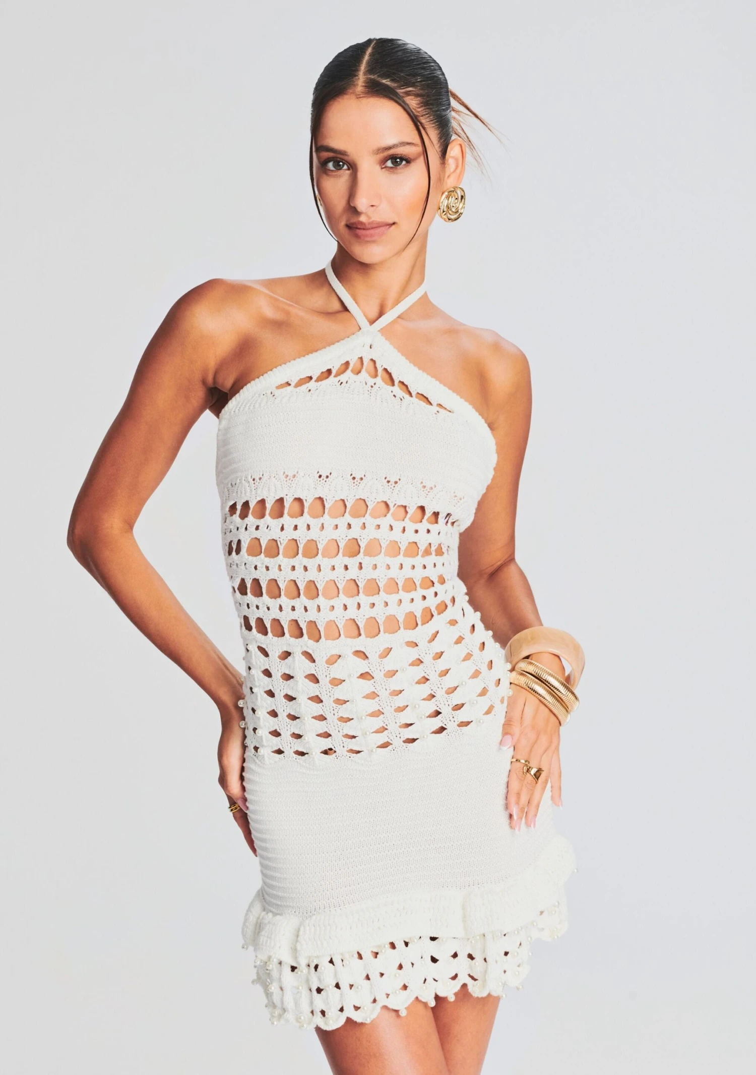 Flaunt your style in our Eze Crochet Pearl Embellished Dress. This woven piece features intricate bodice cutouts and pearls designed across its peplum hem. Shown here in White.