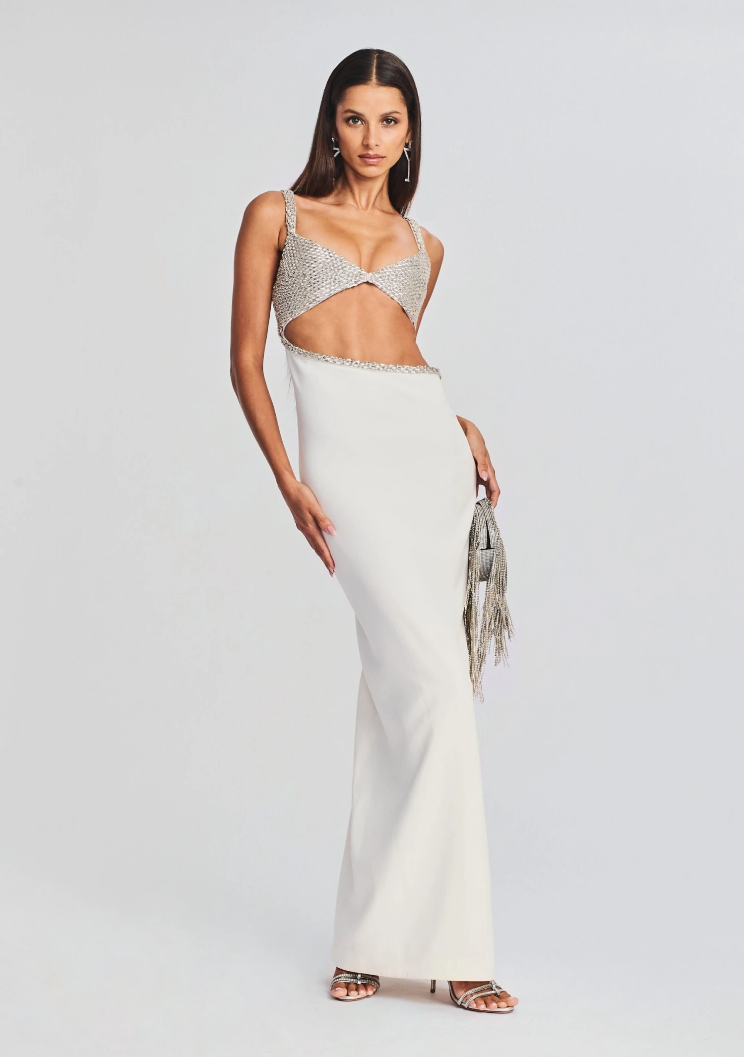 Dare to bare in our Fernanda Dress. Perfect for your next black tie affair, this show-stopping gown features a silver crystal-embellished triangle bralette with matching cascading trim along an asymmetric cutout. An invisible side zipper acts as a final touch. Shown here in White/Silver.