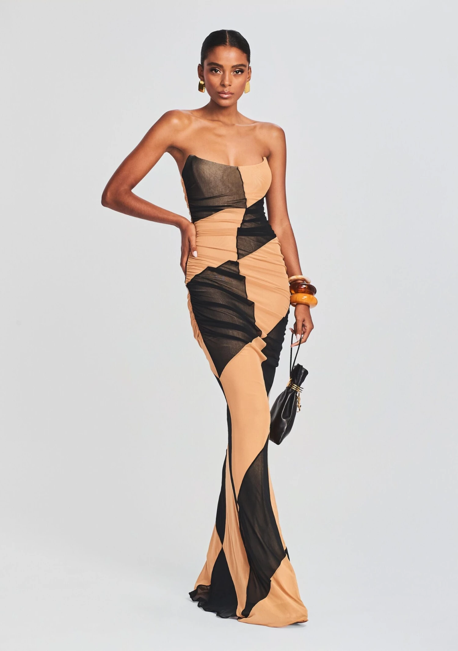 Make a bold statement in our Ford Dress. This strapless maxi gown features a bold color block design and left panel zipper. Shown here in Black/Nude.