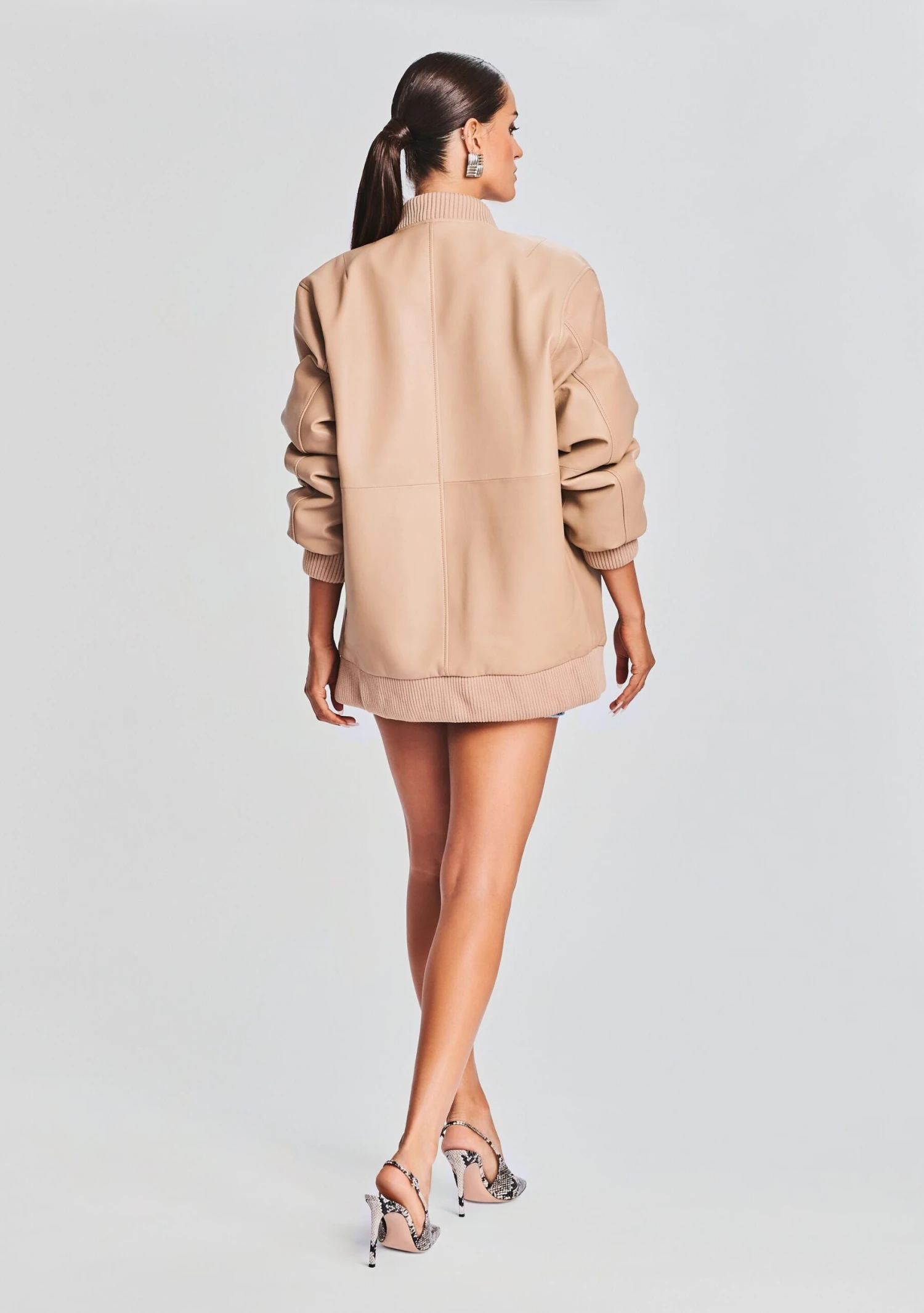 Transition your wardrobe with our Halle Jacket. This oversized moto-style jacket features a zippered front and bodice emblem. Shown here in Tannin.