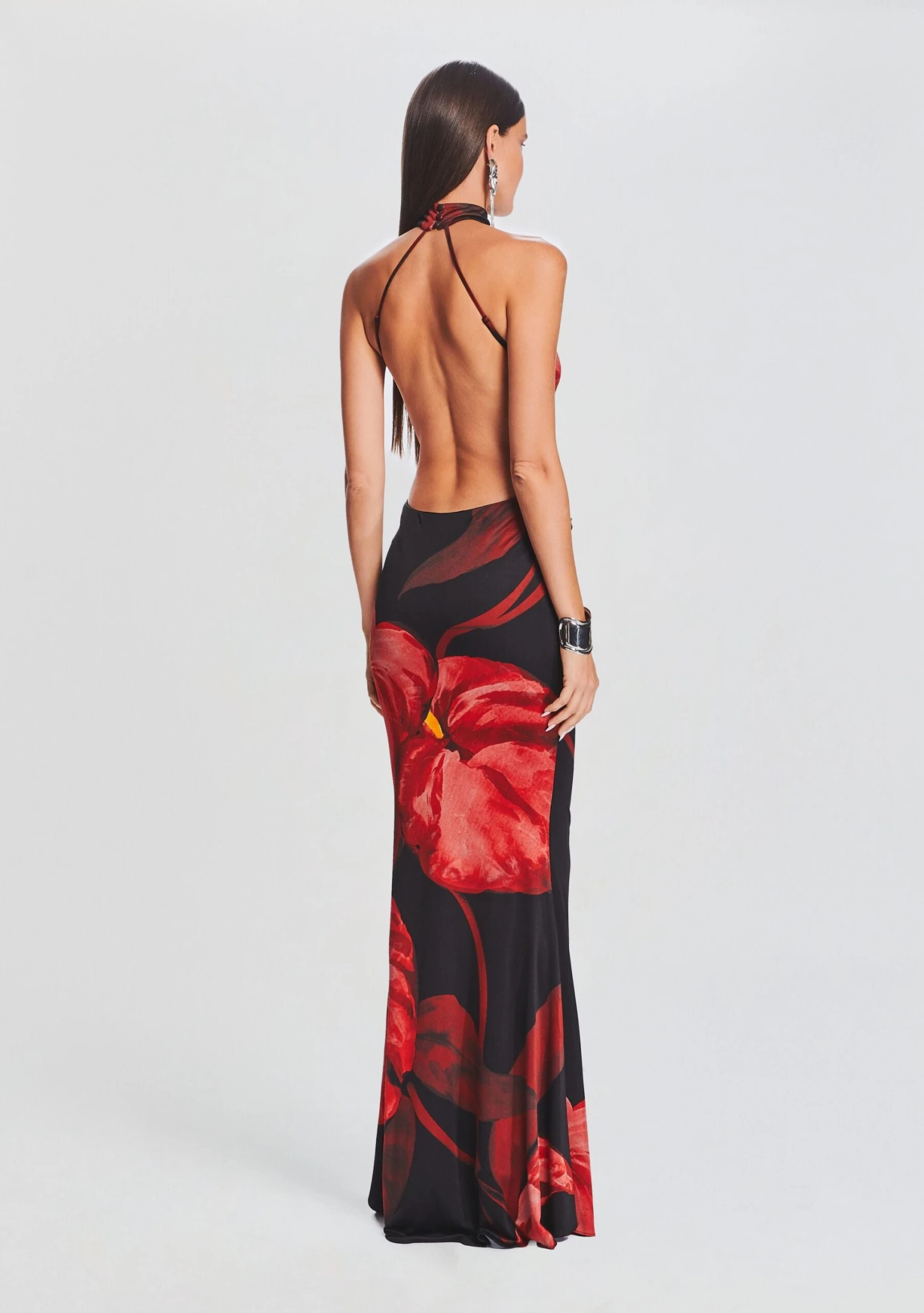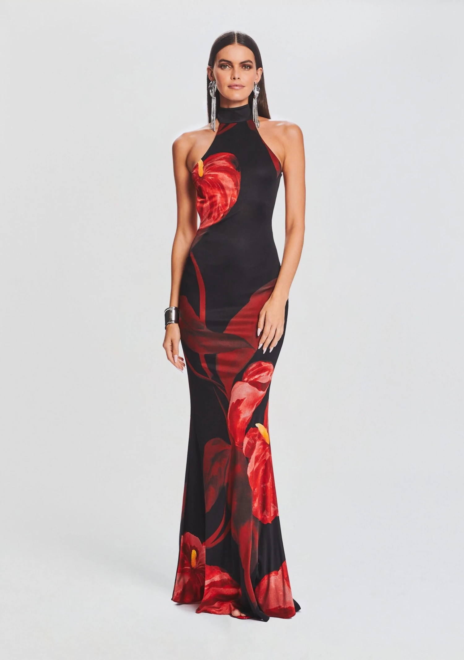 Redefine glamour with our Mabel Dress, featuring an extravagant red floral print and a captivating open back design. This gown exudes grace and style, making it the perfect choice for those seeking a modern yet sophisticated look. The halter neck adds a touch of elegance, while the open back ensures you make a statement at any formal occasion. Shown here in Red Anthurium.