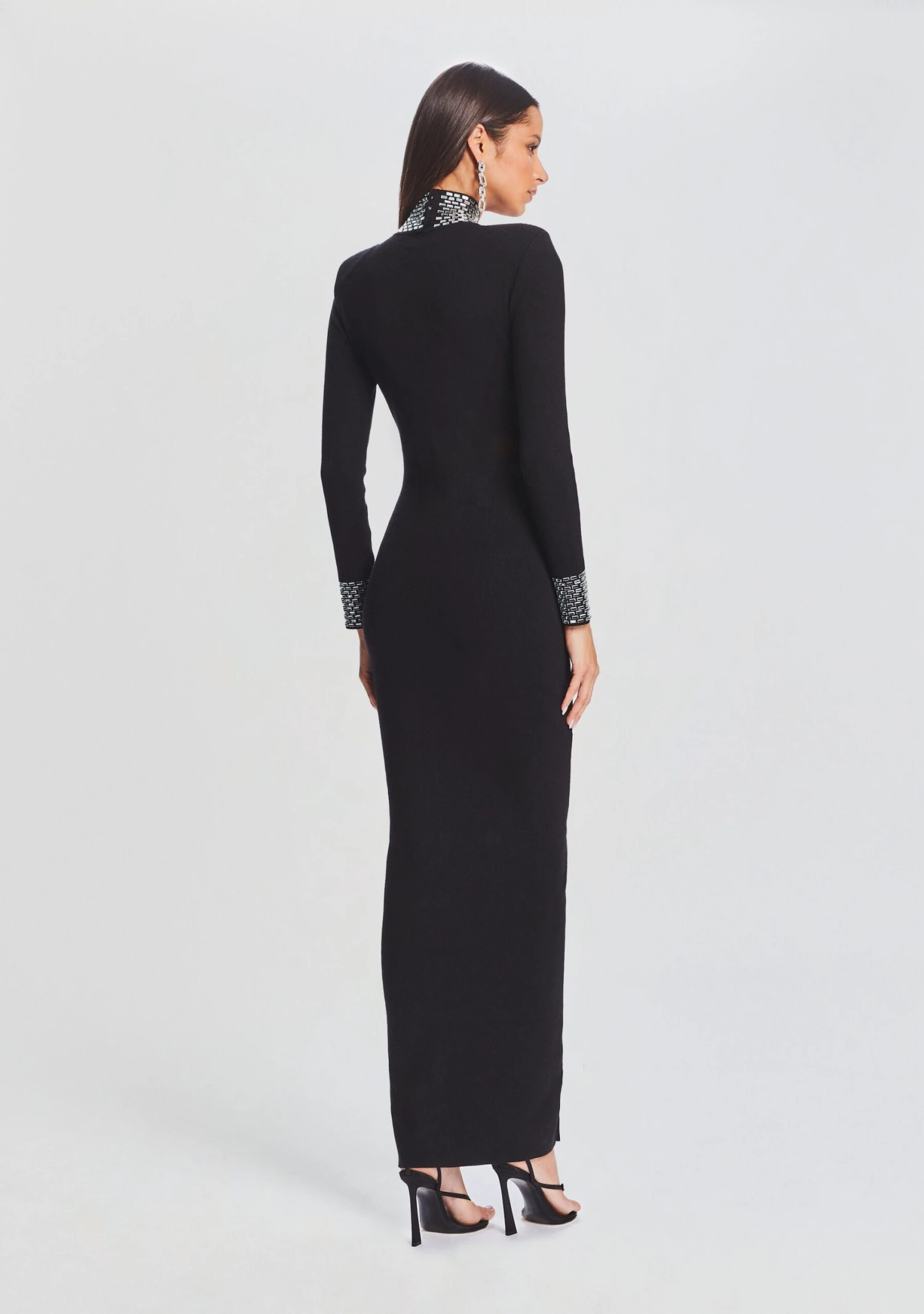 Step into sophistication with our Monroe Dress, boasting a long sleeve design, embellished high neck, and sequin cuffs. This knit, sweater-like gown exudes grace, class, and comfort, making it the perfect choice for gala nights and upscale events. The delicate embellishments on the turtle neck and cuffs add a hint of luxury, elevating your style effortlessly. Shown here in Black.