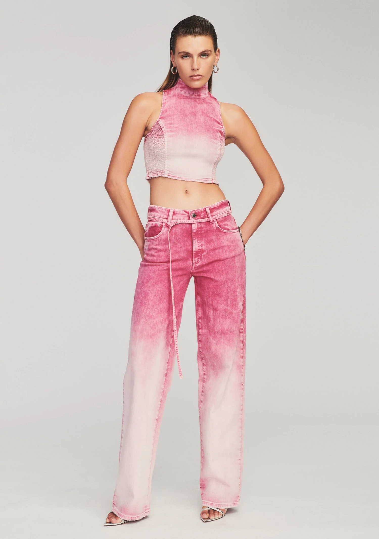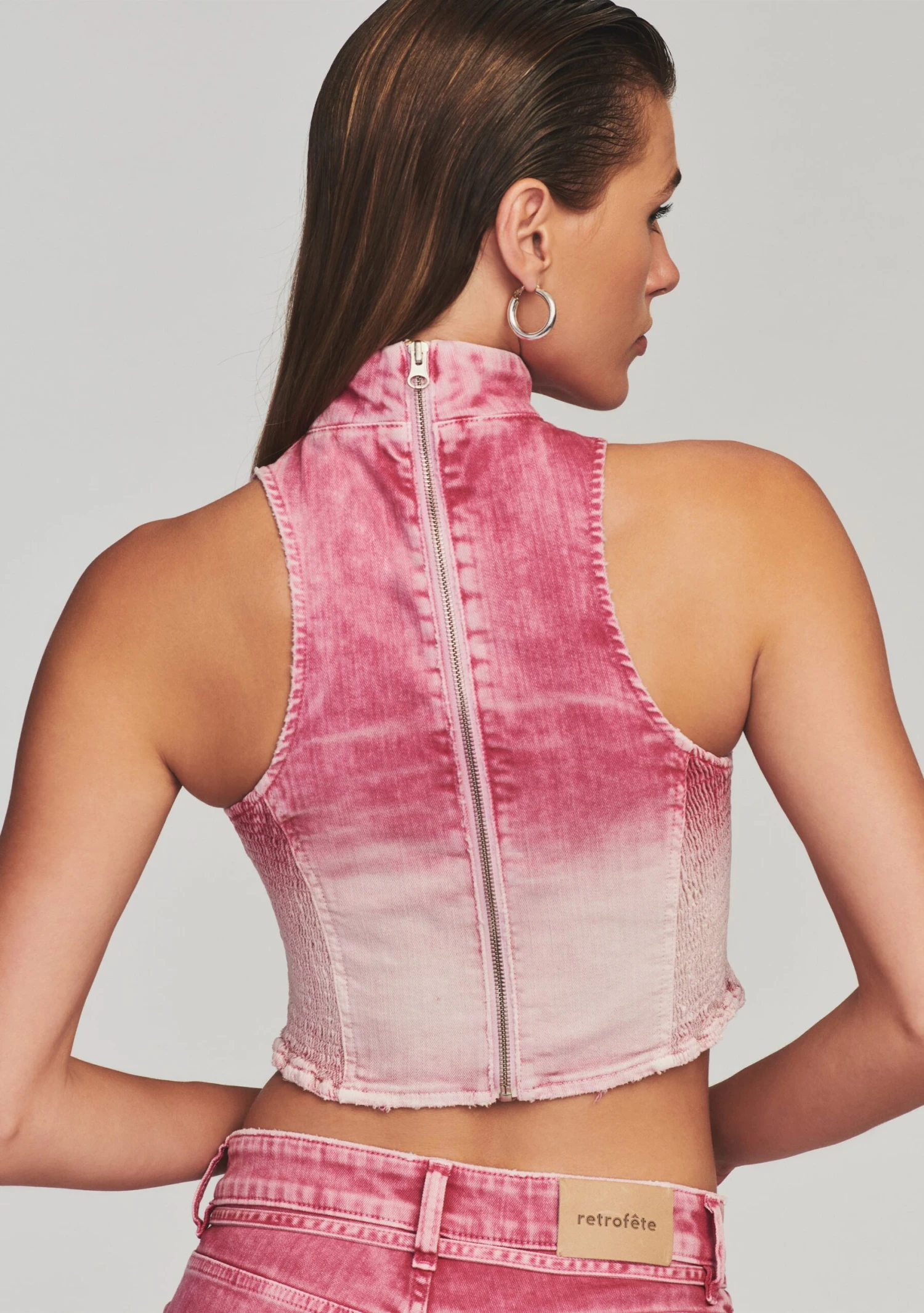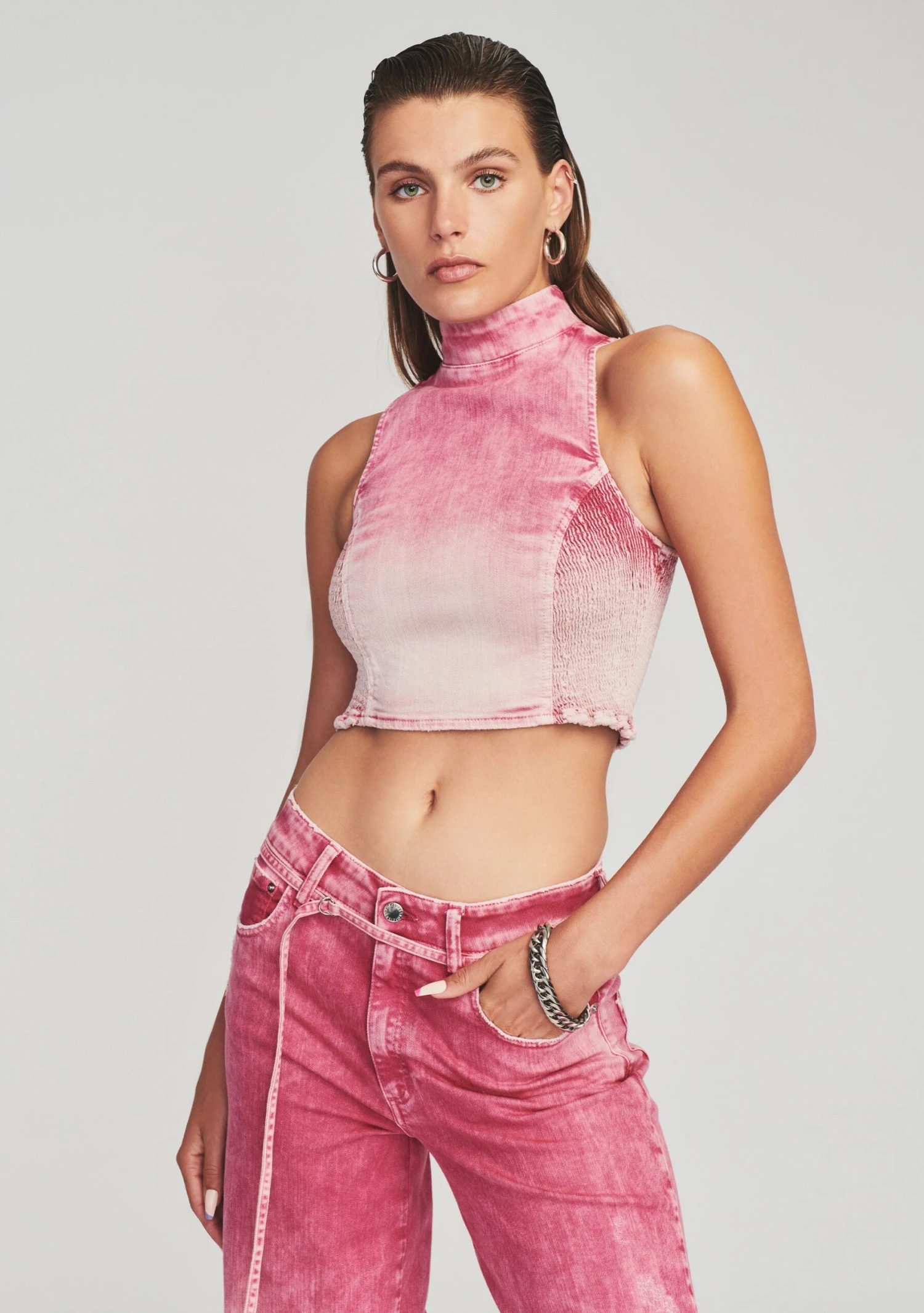 Meet the Nova Top, a denim cropped go-to. Its mock-neckline offers a sophisticated feel, while its subtle distressing and smocked side panels add an edgy feel. Pair with our matching Mora Pant for a sleek daytime look. Shown here in Pink Sorbet.
