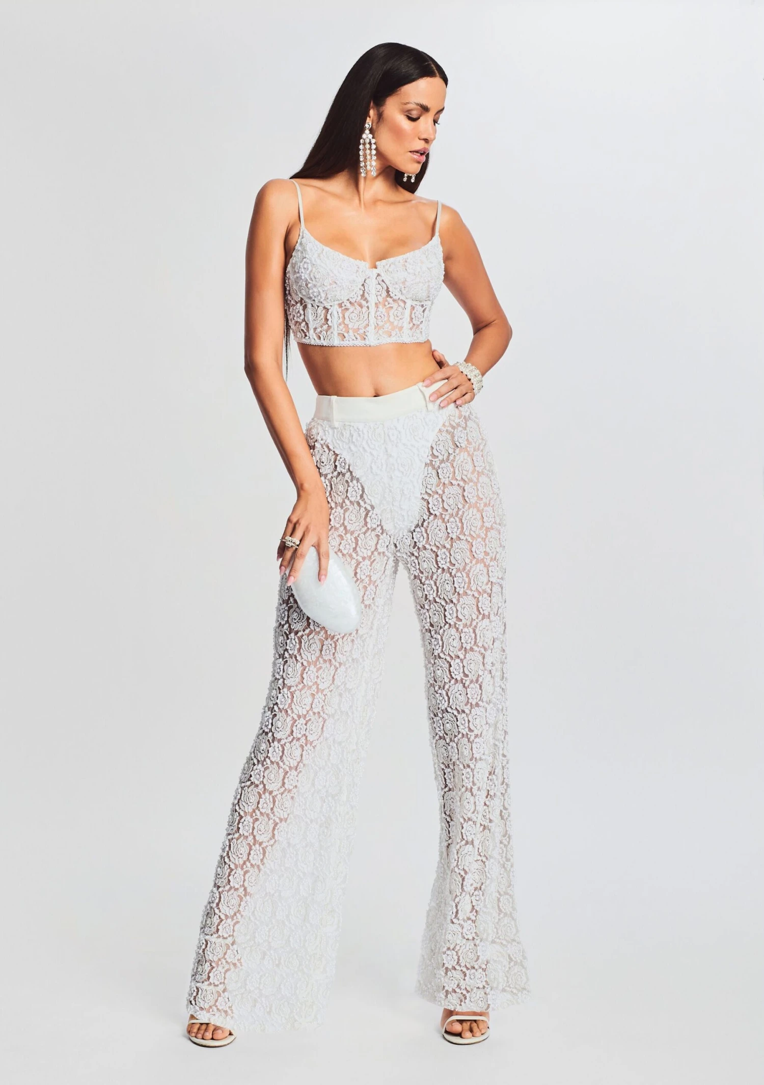 Flaunt your style in our Pessa Top. This strappy bustier top is cut in a delicate floral lace and adorned with a sequin trim. Lined cups and a semi sheer bodice show off just the right amount of skin. The look is finalized with a silver back zipper. Shown here in White.