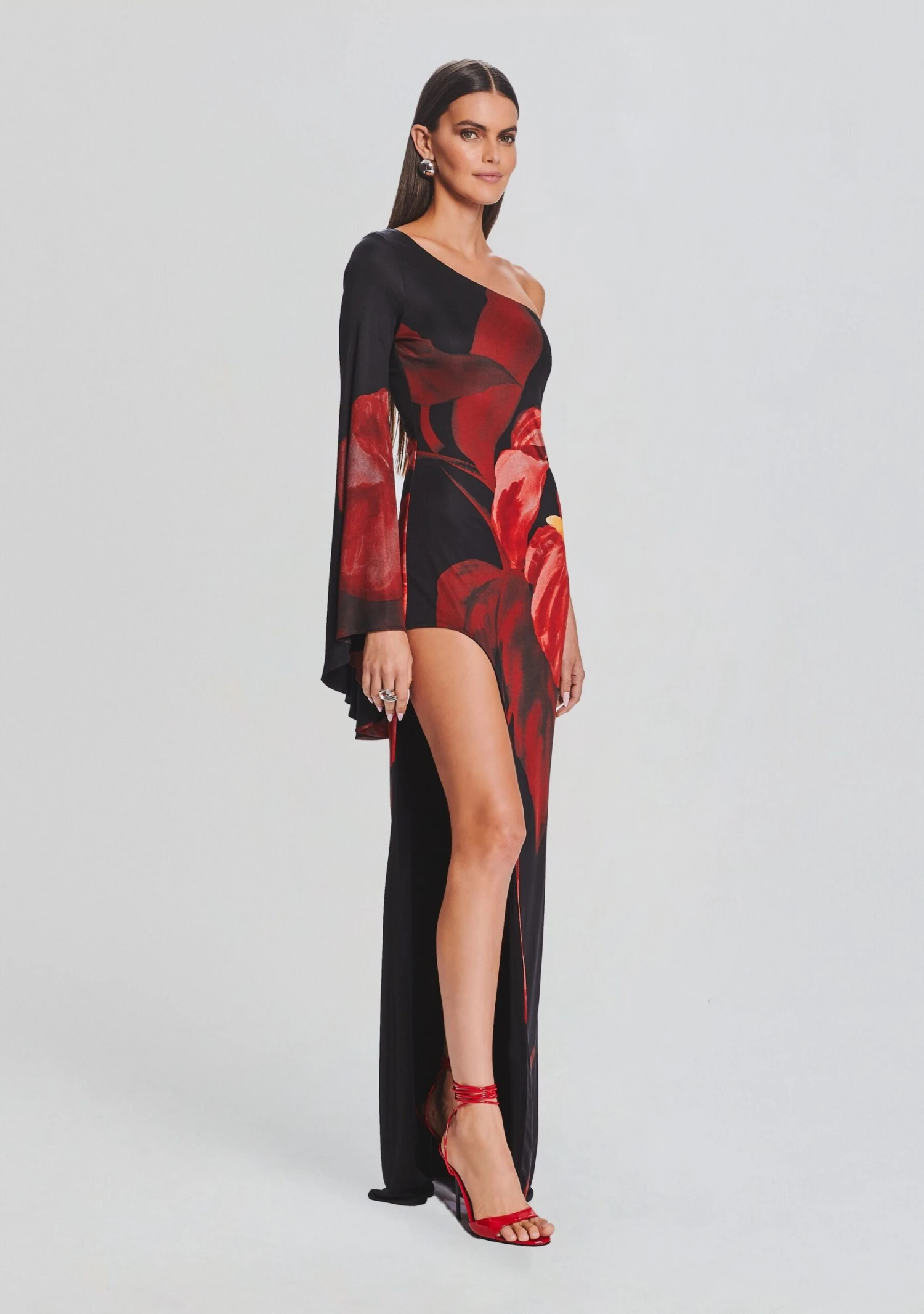 Embrace modern glamour with our Romina Dress, featuring a sleek silhouette and a chic slit. With the sophisticated red floral print, it is designed for those seeking elegance with a contemporary twist. The one-shoulder design adds a touch of allure, while the slit showcases your style and grace. Shown here in Red Anthurium.