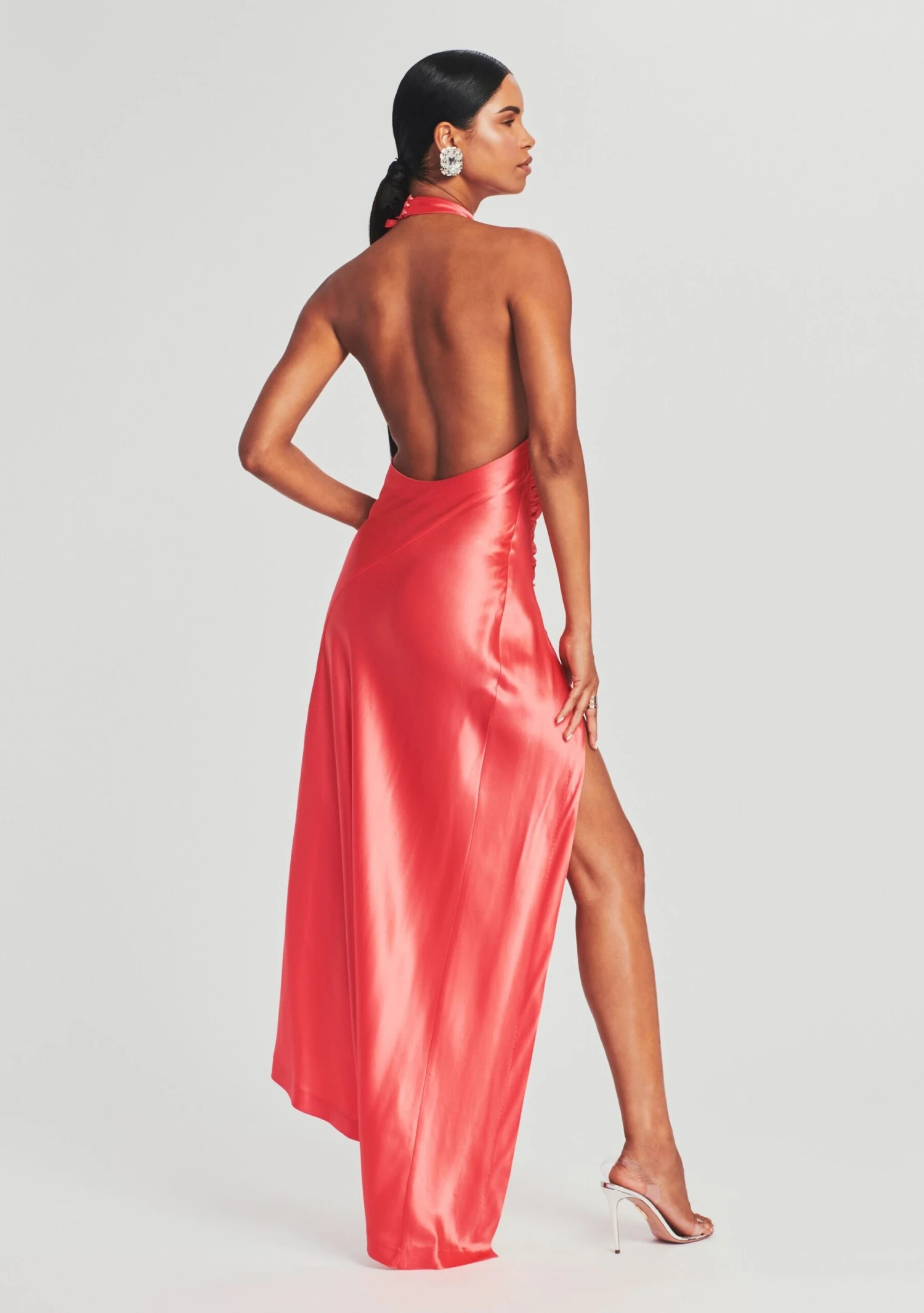 Designed for a modern goddess, the Sabrina Dress makes an impact in its body-hugging satin silhouette. Defined by a leg-baring, high-low hemline and a halter mock-neck, the design is equal parts sophisticated and sexy. Side ruching and an invisible zip closure keep the fit sleek. Shown here in Coral.